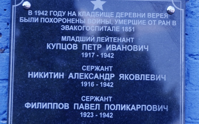 В 1942 г. на территории с.п.Верейское действовал госпиталь. В нем, как и во многих других, от ран умирали те, кто шел на смертный бой, защищая свою Родину. Так, в 2013 г. Илья выяснил, что на территории старого Верейского кладбища находились воинские захоронения. На сегодняшний день удалось найти только одну могилу, за которой ухаживают родственники погибшего солдата. Остальных, увы, нет. Но это не значит, что люди должны уйти в вечность без памяти. Младший лейтенант Петр Иванович Купцов, сержант Павел Поликарпович Филиппов, рядовые Алексей Александрович Жуков, Иван Ефимович Злобин, Василий Кузьмич Шваб, Александр Иванович Юпиков скончались в эвакуационном госпитале в 1942 г. Самому младшему из них было всего 19 лет, самому старшему - 46… Теперь у входа в сельское кладбище висит доска, где увековечены имена смелых, сильных духом, мужественных людей, не доживших до нынешних дней, но защищавших страну-победительницу.