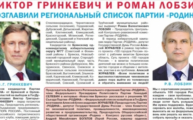 Председатель Брянского регионального отделения партии "РОДИНА", член Президиума Политсовета партии Геннадий Селебин в интервью "Новостям Брянска" рассказал о решениях VII Съезда Партии "РОДИНА": "Федеральный список на выборах в Госдуму возглавили Алексей Журавлев (председатель партии "РОДИНА", депутат Государственной Думы России - член Комитета по экономической политике, промышленности, инновационному развитию и предпринимательству, Председатель Общероссийской общественной организации "Родина - Конгресс русских общин"), Андрей Богатов (Герой России, кавалер орденов Мужества и Красной Звезды, участник войн в Афганистане, Югославии, Сирии), Татьяна Буланова (эстрадная певица; Заслуженная артистка РФ, двукратная обладательница премии "Овация", трёхкратная - премии "Питер FM", семикратная - премии "Золотой граммофон" и премии "Шансон года", девятикратная - премии "Звезда Дорожного радио"), Михаил Хазин (экономист, писатель, постоянный член Изборского клуба, экс-заместитель начальника экономического управления Администрации Президента РФ). Список кандидатов партии "РОДИНА" от Брянской и Орловской областей возглавил Виктор Гринкевич - лидер патриотов Брянщины, Председатель регионального объединения предпринимателей "ОПОРА РОССИИ", Постоянный член российского патриотического Изборского клуба, помощник депутата Госдумы России А.А. Журавлева - председателя партии "РОДИНА". Виктор Гринкевич также выдвинут кандидатом в депутаты Государственной Думы России по Унечскому одномандатному избирательному округу №78. Кандидатом по Брянскому одномандатному избирательному округу №77 выдвинут Роман Лобзин - Председатель Центральной КРК партии "РОДИНА". 27 июля федеральный список кандидатов партии "РОДИНА" зарегистрирован ЦИК России, 30 июля кандидатами в депутаты Государственной Думы по одномандатным избирательным округам Избирательной комиссией Брянской области зарегистрированы Виктор Гринкевич и Роман Лобзин.
