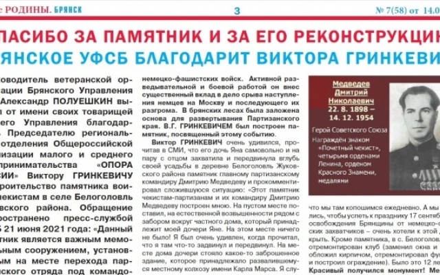 Руководитель ветеранской организации Брянского Управления ФСБ Александр Полуешкин выразил от имени своих товарищей и всего Управления благодарность Председателю регионального отделения Общероссийской организации малого и среднего предпринимательства "ОПОРА РОССИИ" Виктору Гринкевичу за строительство памятника воинам-чекистам в селе Белоголовль Жуковского района. Обращение распространено пресс-службой УФСБ 21 июня 2021 года: "Данный памятник является важным мемориальным сооружением, установленным на месте перехода партизанского отряда под командованием Героя Советского Союза Д.Н. Медведева за линию фронта в годы Великой Отечественной войны. Указанное событие приобретает особое значение в год 80-летия основания партизанского движения на Брянщине. От лица ветеранов органов безопасности выражаем благодарность В.Г. Гринкевичу за помощь в создании памятника и обеспечение его реконструкции".