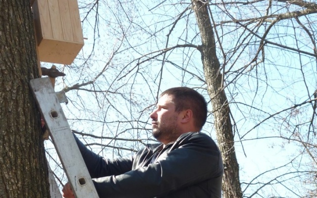 В парке участников акции ждала инициативная группа волонтеров во главе со своим руководителем - председателем городского отделения партии "РОДИНА" Михаилом Предеиным. Они не только смастерили, как и школьники, птичьи дома, но и позаботились о технической стороне дела. Подготовили лестницу, молоток и гвозди.